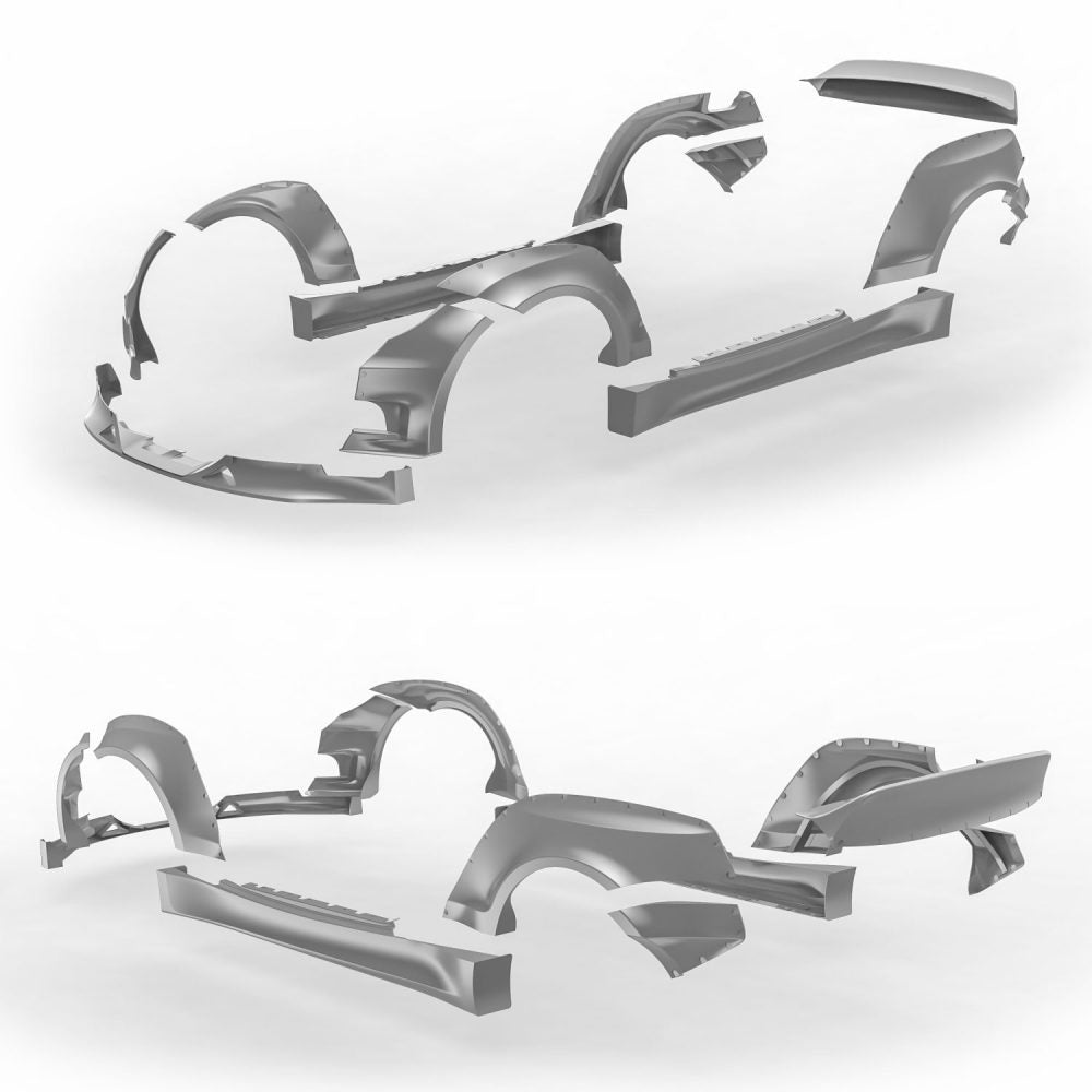 Made out of durable lightweight impact-resistant ABS plastic; May be blended in with the body or left with exposed hardware; Comes with mounting hardware and gaskets; Adds  2.8 inches (7cm) per side up front and  3.1 inch (8cm) per side out back; front fender flares, front bumper flare extensions, rear fender flares, rear bumper flare extensions, side skirts, ducktail trunk spoiler (optional), front bumper lip (optional)
